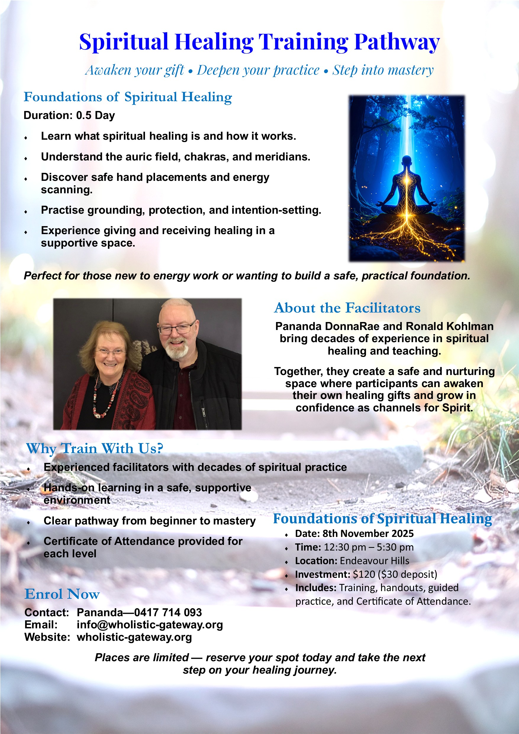 Saturday 8th November 2025: Join us for our Spiritual Healing Training. It is designed to guide you in developing the skills, techniques, and intuitive awareness necessary to offer profound healing to individuals and groups. Spiritual healing is a journey, not a single step. Each level of training builds on the last, giving you the skills, confidence, and spiritual grounding to progress safely and with integrity.